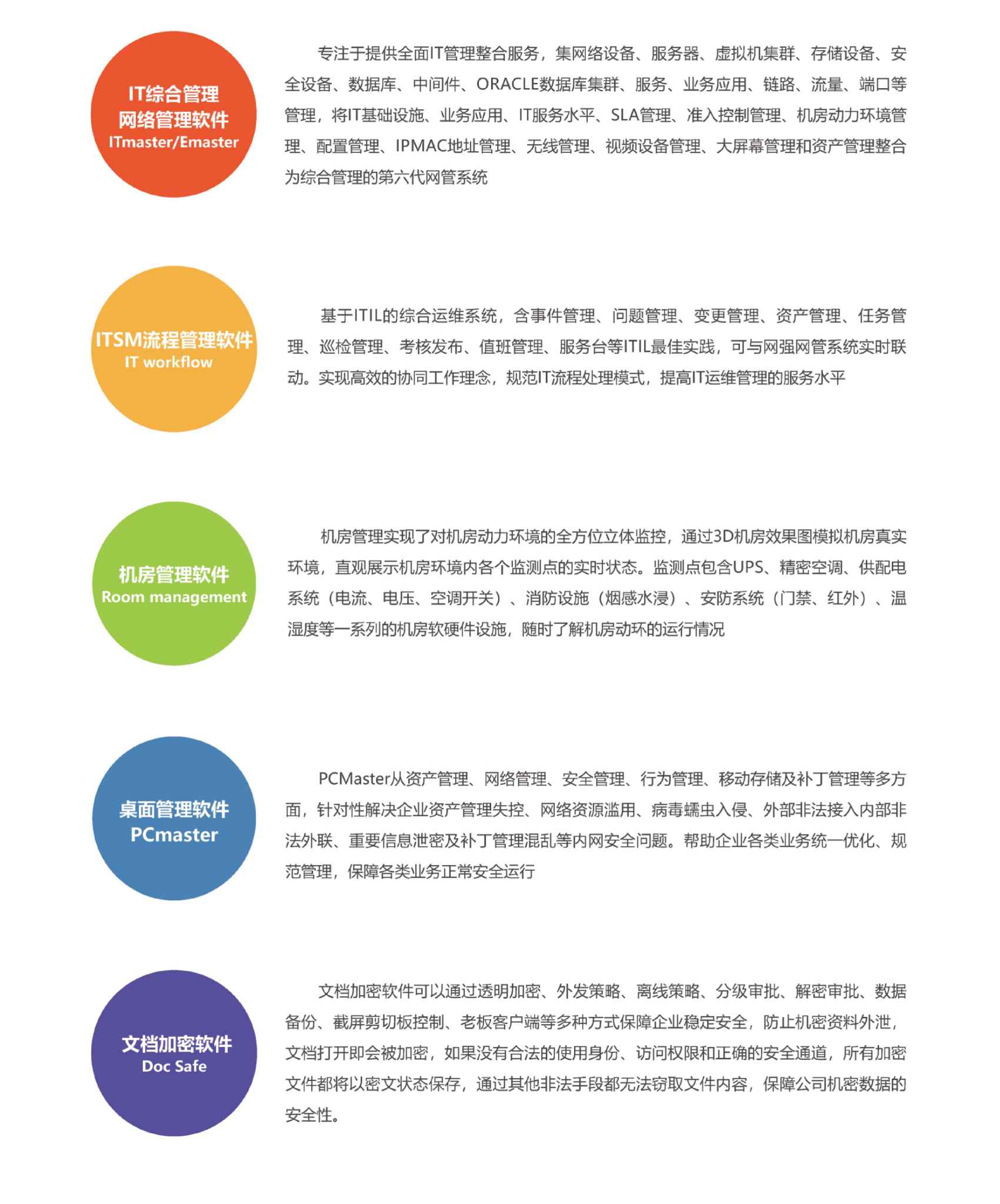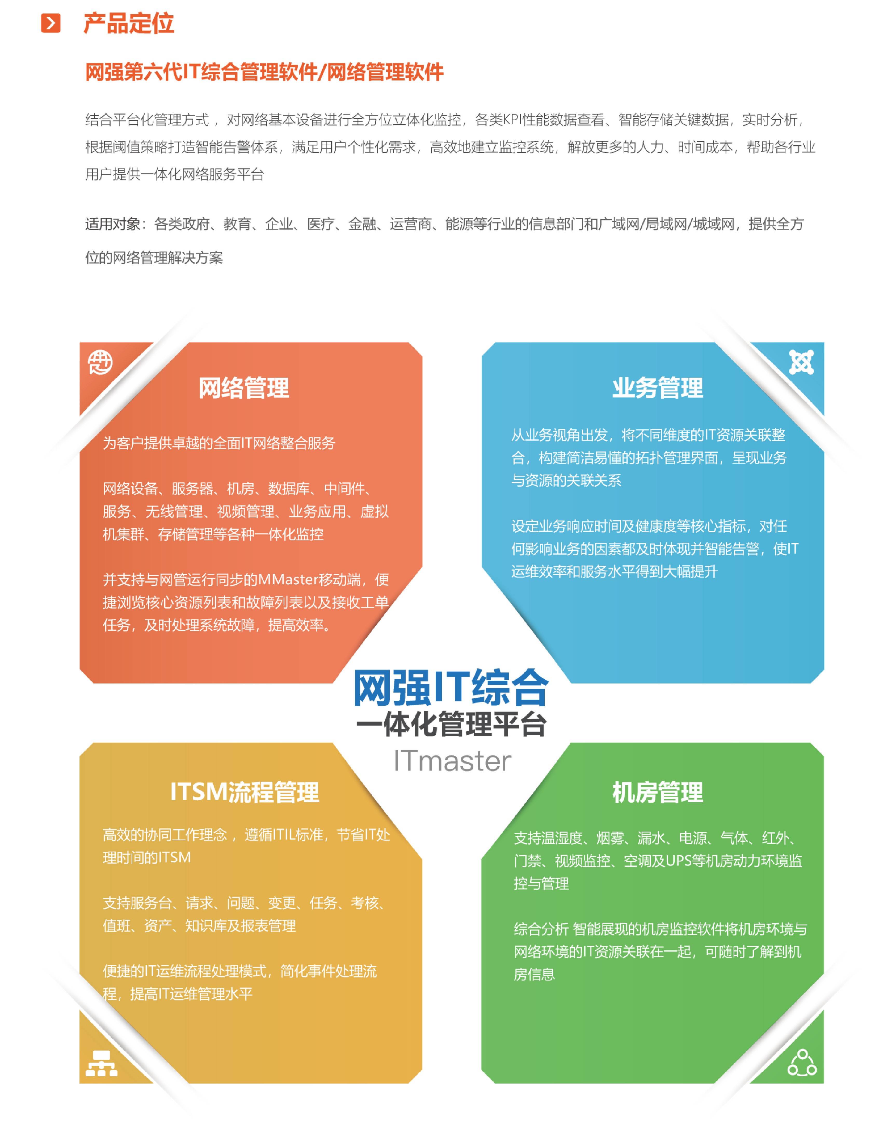 网强旗下的IT综合管理、网络管理、ITSM流程管理、机房管理、桌面管理、文档加密管理全系列产品和解决方案,已经成功和广泛应用于政府、教育、医疗、大型企业、交通、金融、能源、电信运营商及制造等各个行业。