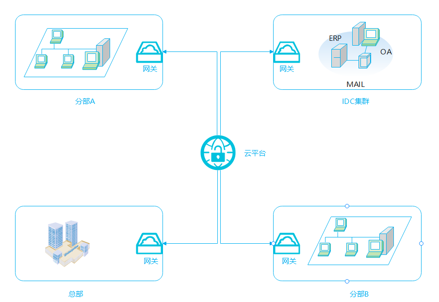 云端组网的大链路传输、快速恢复、BGP负载均衡特性,为多分支企业异地组网提供快速通道,助力企业业务加速扩张。